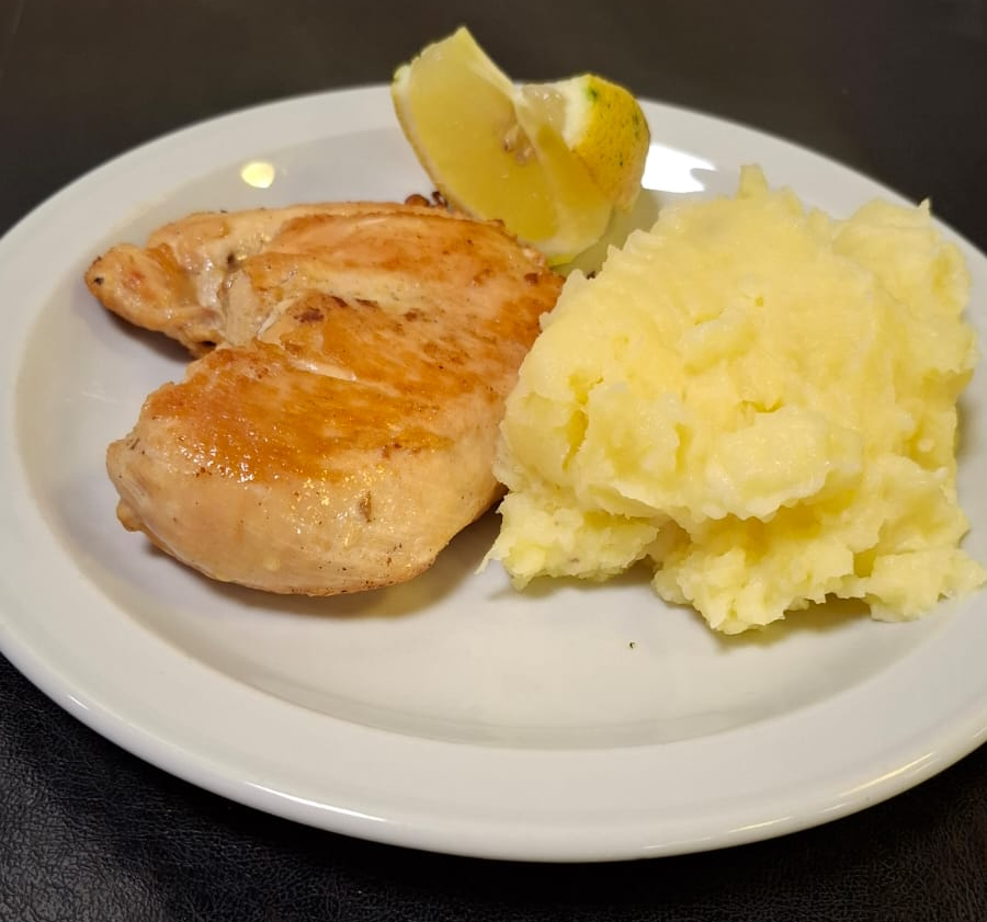 Pechuga de pollo grillé o a la crema con guarnición (pure, papas o ensalda).